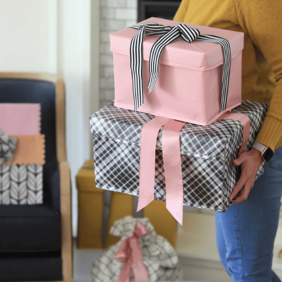 2 Color Options: Navy or Pink. Collapsible, reusable gift box with grosgrain ribbon closure.